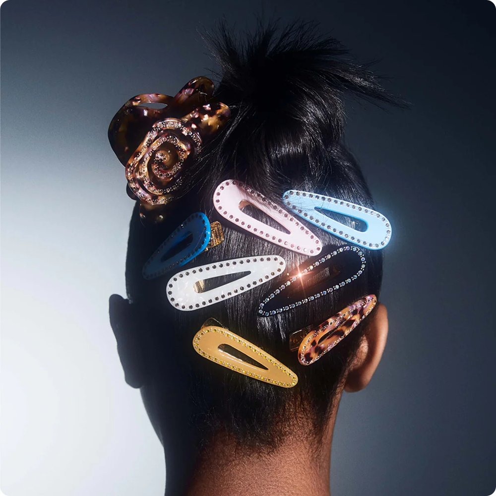 This limited-edition Katya x Moussse clip brings elegance to your routine. Handmade from pearlescent magenta acetate with iridescent crystals, it features a snag-free metal grip to keep hair effortlessly in place.